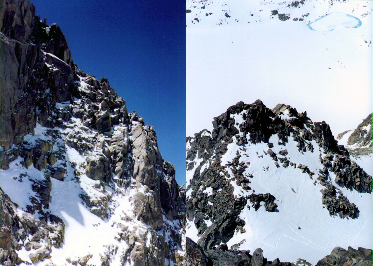 | Sill & Apex peaks from 1999 high camp Snow Chute to L shaped snowfield climbed in 1997 (1999 picture) Sill & Apex peaks from 1999 high camp | |